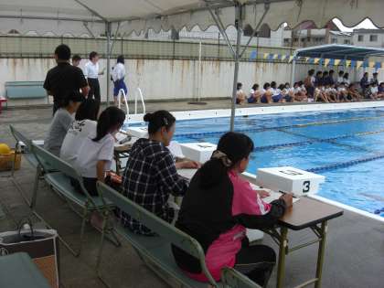三年生の水泳大会では出場選手をコールするなど、頑張りました。