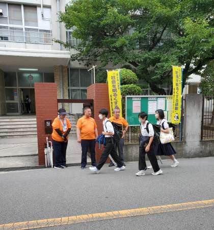 7月19日、本校正門で登校して来る生徒たちに、地域の方々が、「おはようございます」の声かけをしていただきました。生徒たちも、笑顔で挨拶を返していました。