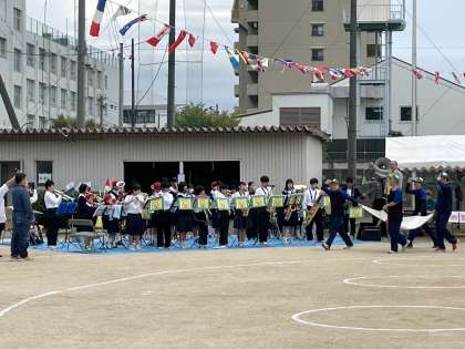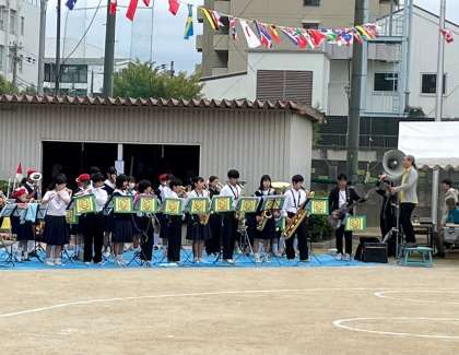 3連休の中日にあたる10月8日(日)放出小学校第2グラウンドにて放出地域の体育祭が開催されました。雨天の心配をよそに時間通りに開始され、本校吹奏楽部と放出小学校ジュニアバンドがファンファーレと入場行進の音楽を演奏しました。各町会より集合した多くの方々に見守られ、「開会式に花を添えていただきました」との賛辞を頂戴いたしました。