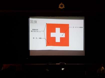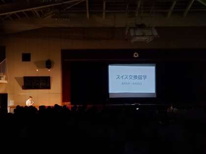 3年の武原さんは、第21回日本・スイス青少年交流使節団の一員として選ばれ、15日間スイスでホームステイなどの体験をしてきました。スイスでの経験や学んだことの発表でした。