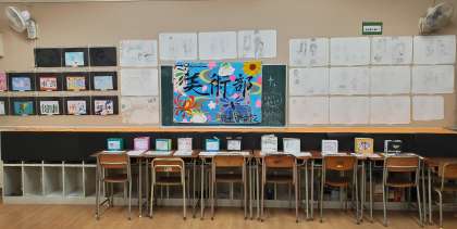 夏休みに階段アートに挑戦しました。教室には美術部の活動の中で取り組んだ作品を展示しています。