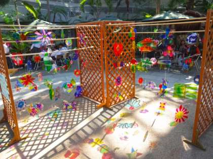 ワークショップで制作したお花をテグスでつなげ、モビールにして、咲くやこの花館の会場に合同で展示しました。光で花が色とりどりに輝く一つの作品となりました。