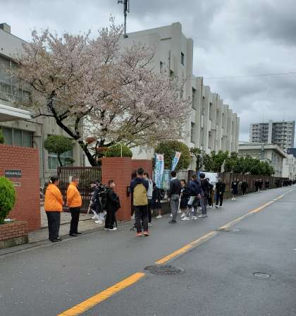 4月9日(火) 本校正門で登校して来る生徒たちに向かって、地域の方が、「おはようございます」と声かけをしていただきましたら、生徒たちも、笑顔で挨拶を返していました。