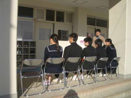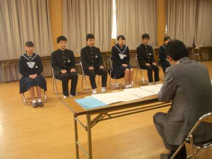 面接練習も3組に入りました。初回の頃にくらべると、生徒たちもずいぶん落ち着いて受け答えできているようです。直前の説明を聞く姿にも真剣さが感じられます。