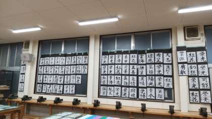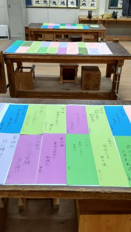 技術室では、各学年の国語の授業での作品が並んでいます。