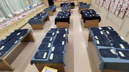 調理室の奥の被服室では、家庭科の作品と家庭科部の作品の展示があります。