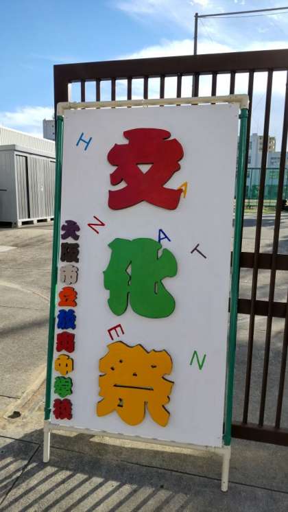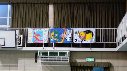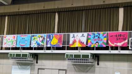 体育館の2階手すりからは、体育大会のときに作成した、各学級の学級旗が吊り下げられています。