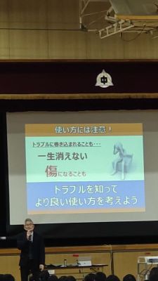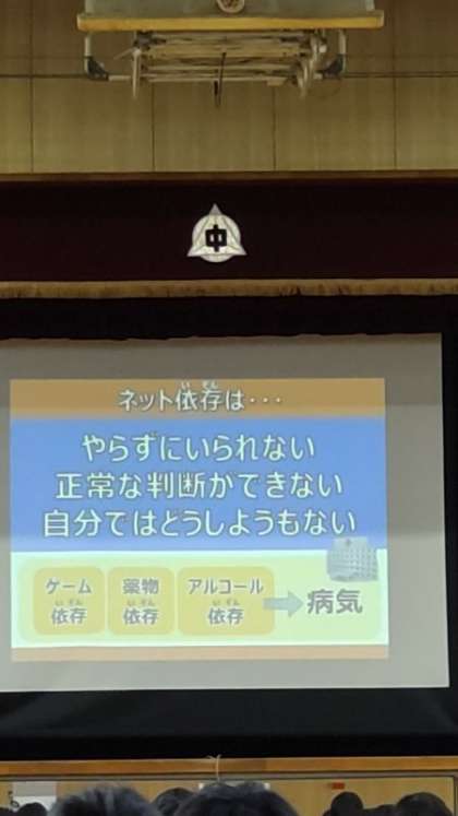 ネット依存は病気の一種であること、トラブルを防ぐためにはルールやマナーを守り、コントロールできるようにしなければならないこと、リアルの世界も大切にするべきであるとのお話でした。