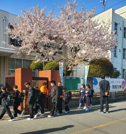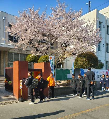 4月9日(水) 地域の方が、本校正門で登校して来る生徒たちに向かって