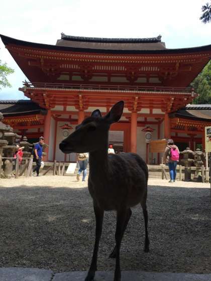 観光客がたくさん。鹿さんとチェックポイントで生徒を待つ教師たち。ここは春日大社。