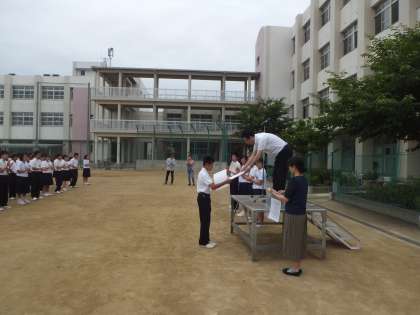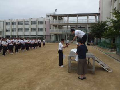 6月4日 大阪市中央体育館において行われた大会で、本校生徒2年生が個人総合優勝しました。種目別でもゆかと鉄棒で優勝でした。7日全校集会での表彰風景です