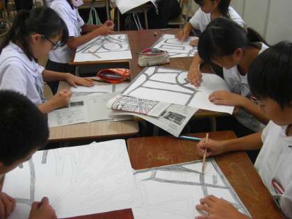 文化祭に向けて、1年生の作品作りが本格的に始まりました。今回、制作するのはステンドグラスアートです。1学期にそれぞれがデザインしたものをもとに下絵を書いているところです。