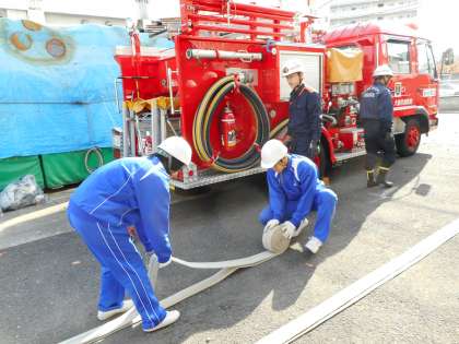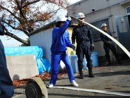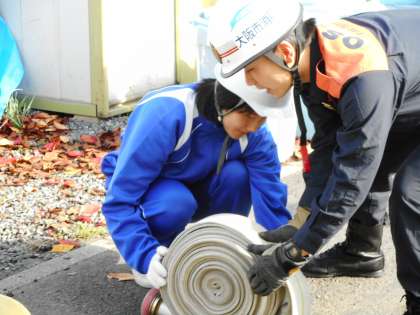消防ホースを真っ直ぐに伸ばし、巻き取る練習です。なかなか真っ直ぐ伸びずに苦戦しています。ペアを組んで巻き取ります。