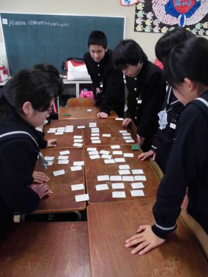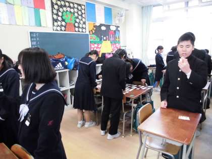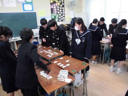 百人一首大会に向けて練習しています。実行委員会の生徒が読み札を読んでいます。皆真剣なまなざしで、札を追いかけています。