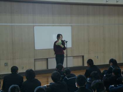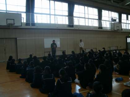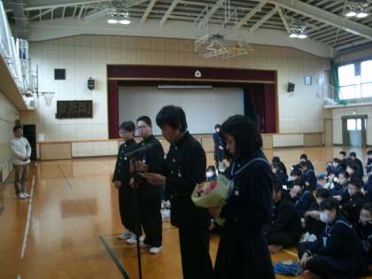 2年生所属の数学科宮田先生、理科の矢幡先生が転勤されます。学年集会で離任式を行いました。生徒のお礼の言葉、花束贈呈を受けての、二人の先生方のお別れの言葉に、生徒も教職員も寂しさと感謝に涙しました。転勤される新しい学校での、更なるご活躍を生徒・職員ともに祈っています。