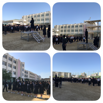 5月に入りまさに五月晴れの今日、全校集会が開かれました。生徒会の司会進行で、今日も8時25分から始めることができました。
