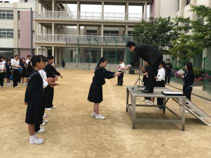 今日の全校集会で、学級の各種委員の人たちに認証状が伝達されました。それぞれの委員の仕事がスムーズに進むために、学級でどのようにしていけばよいか、また自分はどうすればよいかを考えて、放出中学校がよりよい学校になるようにがんばりましょう!
