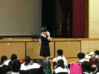学年主任の川俣先生から、添乗員さん、写真屋さんの紹介があり、最後に生徒代表から力強い言葉があり、大きな拍手で結び、出発式を終えました。