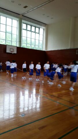 > 小雨ですが、今日の外での活動はカッターのみです。ただいま、3組A班と1組は、体育館で大縄跳びの練習中です。