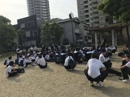 晴天に恵まれ、2年生の春の遠足が実施されています。地下鉄のエンジョイ・エコカードを使って、班ごとに行動します。午前中は福島区の大阪市中央卸売市場に向かいます。