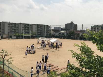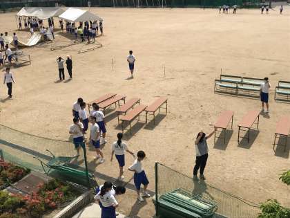 明日に行われる体育大会に向けて、係生徒が会場づくりに励んでいます。トラックにラインを引き、その外側に観客席用の長椅子が置かれはじめました。また、本部席や来賓席用の大きなテントも組み立てが始まりました。この後はトラック内のコースのライン引きなどが行われます。
