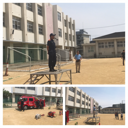担当の芦田先生から避難の報告があり、4分16秒で全校生徒、職員の避難が完了しました。その後城東消防署員の方からのお話をいただきました。