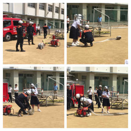 次に、可動式ポンプを用いた放水訓練を行いました。ディーゼルエンジンを搭載したポンプに実際にホースをつなぎ、火に向かって一気に放水しました。今日は消防自動車(ポンプ車)に貯めた水を使いましたが、実際には川や学校のプール等にホースを突っ込み、そこから水を吸い上げるとのことでした。また、今日使った可動式ポンプは、西放公園内に常備されているとのことでした。