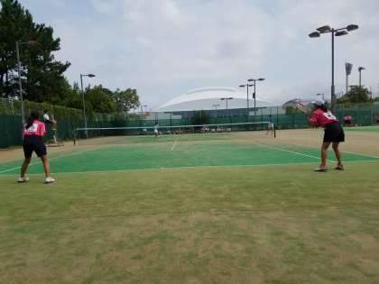 舞洲テニスコートにて3年3ペアが団体戦形式で試合です。予選は摂津第一中と港南中とのゲームです。