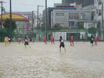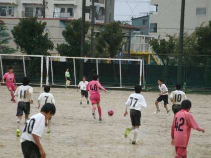当日は、朝から小雨模様で、午後からは本降りの雨という悪コンデションでした。試合は1勝2敗でした。しかし、選手たちは熱気あふれるプレーを繰り広げ、日頃の練習成果を発揮していました。また合間には、2年生を中心としたチームのゲームも行いました。