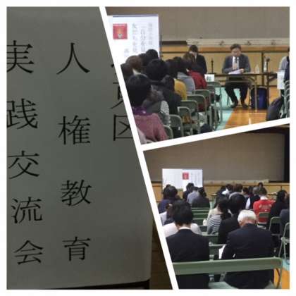11月8日(水)午後3:30分より放出中学校を会場に、本年度の城東区人権教育実践交流会が開催されました。天候が心配されましたが、開催時刻には何とか止んで校門をくぐり足早に会場へ向かう先生方が続きました。