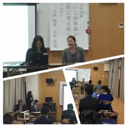 体育館では放出小学校の高田憲彦先生の発表「自分をみつめて友だちを見つめて」があり、座席がほぼ満席になる105名の参加、一方多目的室では放出中学校の本間瑞恵先生・大原佳美先生の発表「いじめ事象から多面的に考え取り組んできたこと」があり、こちらも座席がほぼいっぱいの46名の参加がありました。それぞれの発表の後参加者たちが活発に意見交換し、日ごろ各校で行われている人権教育の更なる深化充実につながる交流会となりました。
