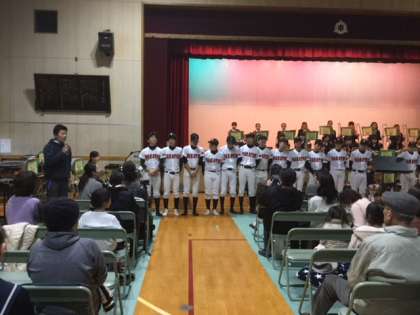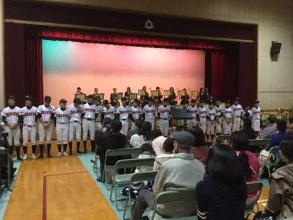 春の大阪府大会で優勝したことの報告が顧問の木戸先生からありました。大阪府下には約400校の中学校の野球部がありますが、見事その頂点に立ったとのことで、会場から大きな拍手が送られていました。