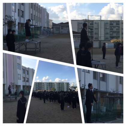 お天気は良いものの、寒さが身に染みる中で定例の全校集会が行われました。生徒会役員の進行で、整列・服装点検の指示で各自がさっと動いています。