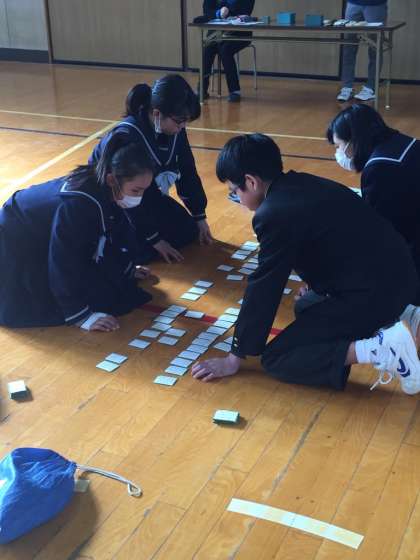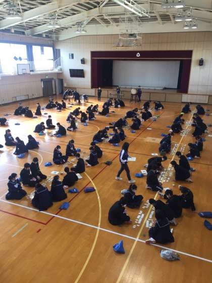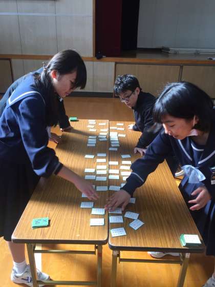 昨年に続き、今年も2年生は百人一首大会を行いました。太鼓の音が鳴ると、静かになり、緊張感が漂います。そして上の句が詠まれたとたんに「はい」と札を取る活発な姿。新春にふさわしいほほえましいひとときでした。個人賞、クラス賞ともに次の学年集会で表彰します。