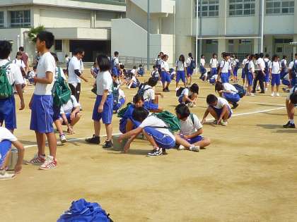 集合、グランドの石拾い、ラジオ体操