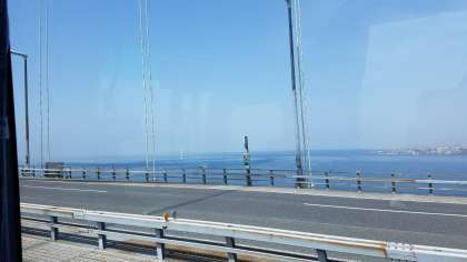 交通渋滞により、少し予定より遅れていますが、明石海峡大橋を通過しましまた。いい天気です。