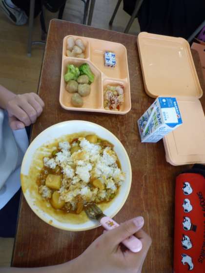給食に慣れてきたとはいえ、一人一人にカレーを取り分けるのにはやはり少し時間がかかりました。4時間目の終了5分前から準備を始めて何とか時間内に喫食できました。