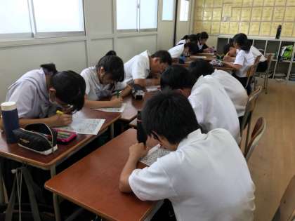 1年生の文化祭展示作品はモザイクアート。一つ一つの小さな点を指定された色で塗る作業を続けてきました。地道な作業をコツコツとおこない、全員の分をつなぎ合わせると大きな一枚の絵になります。