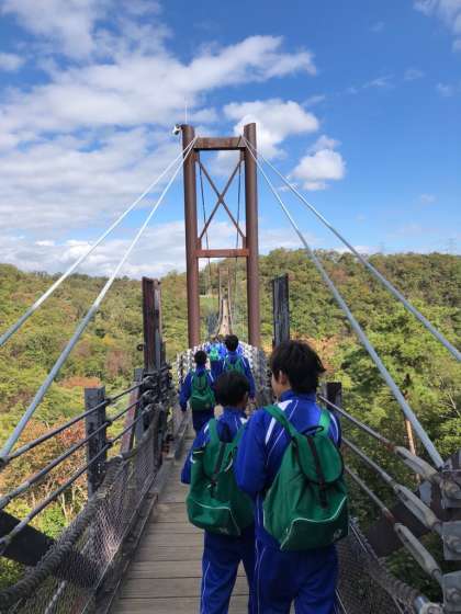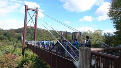 ほしだ園地にある「星のブランコ」、全長280m、最大地上高50mの木床版吊り橋です。ここを渡るのがこの遠足の一大イベント。キャーキャー言いながらも生徒も教員も全員渡り切りました。生徒たちより実は教員の方が腰が引けていたような…。晴天の秋空の下、吊り橋からの景色は最高でした。みなさんよく頑張りましたね。