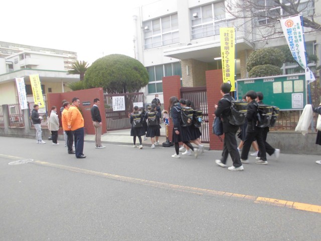 1月9日(金) 地域の方が、本校正門で登校して来る生徒たちに向かって