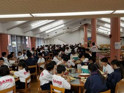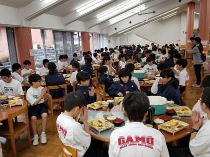 2日目の朝食です。みんな元気な様子です。なかには、ご飯を4杯おかわりする人もいました。天気は、くもり空で、雨はやんでいます。このあと、飯ごう炊飯の準備にとりかかります。