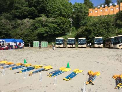 ラフティング開始場所に到着です。バスの中でレクチャーを受けています。