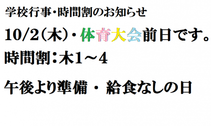 明日10月2日(木)は、体育大会前日となります。午前中は、通常の授業です。時間割を間違えないようにしてください。