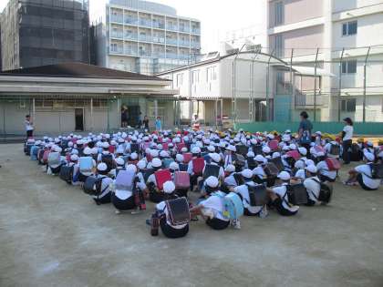 午後3時30分に部活動体験を終了し、運動場に集合している様子です。