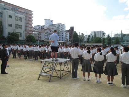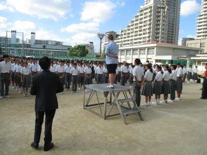 写真は、朝の全校集会で、全校生徒を前にして、英語と日本語で自己紹介している様子です。