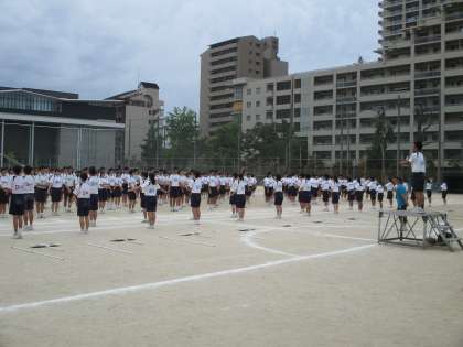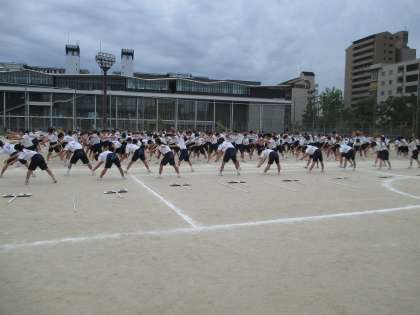 写真は、体育大会の全体練習のラジオ体操の様子です。