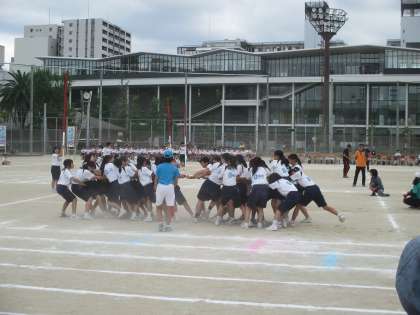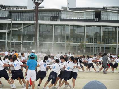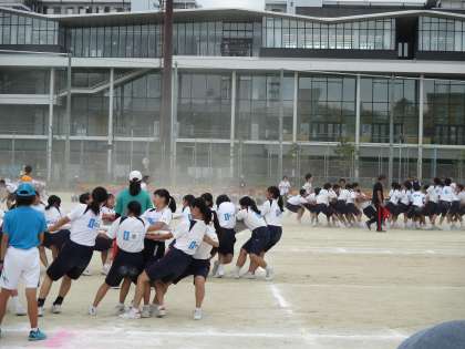 体育大会の3年学年種目「棒引き」の3年2組と1組の対戦の様子です。