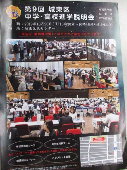 本日10月20日(日)10時30分より、城東区民センターにおいて、城東区PTA協議会主催で「第9回 城東区 中学・高校進学説明会」が開催されます。