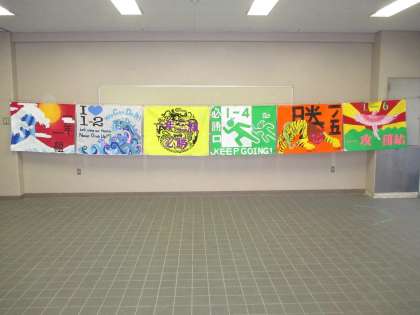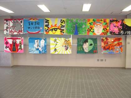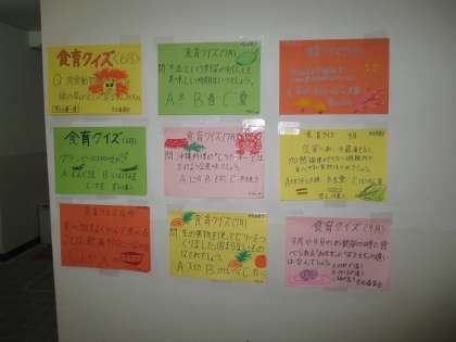 ピロティに掲示されている学級旗と、文化委員会による食育クイズです。