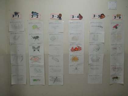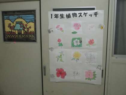 1年生の理科による「植物スケッチ」と、3年生の「無脊椎(せきつい)動物スケッチ」の展示作品です。